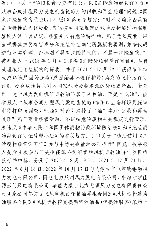 2023年3月9日,奧吉娜公司收到固始分局通過12369環境信訪平臺的短信答復:“反映問題不屬實”。3月10日,奧吉娜公司向固始分局負責人電話詢問,其解釋稱:經調查核實,華陽長青公司沒有再生風電潤滑油銷售,出售的是新油。否定了奧吉娜公司的舉報內容。對此,奧吉娜公司表示強烈不滿。3月11日,奧吉娜公司向環境部投訴固始分局的不作為和亂作為。2023年5月26日,奧吉娜公司收到12369環境信訪平臺的短信答復。答復部門為信陽環境局。令人啼笑皆非的是,答復稱,華陽長青的許可證有效期沒有問題,與舉報內容風馬牛不相及。2023年6月13日,奧吉娜公司再次向環境部提出申訴,指出,奧吉娜舉報的不是許可證有效期問題,而是許可證的適用范圍錯誤、違法。2023年7月27日,奧吉娜公司收到回復稱,經信陽市生態環境局現場檢查,未發現固始分局不作為情況。2023年8月3日,奧吉娜公司向河南省生態環境廳(以下稱:環境廳)舉報信陽環境局包庇固始分局的行為。環境廳對此高度重視,有關處長和奧吉娜公司負責人進行了面談。2023年9月13日,信陽環境局向奧吉娜公司致《信陽市生態環境局關于沈陽奧吉娜化工有限公司舉報華陽長青投資有限公司違法經營及固始分局不作為、亂作為等問題調查處理的函》。函中:一是,以“齒輪箱”替換“齒輪箱油”,偷換概念;二是,做出了廢風電合成(齒輪)油不屬于危險廢物的結論;三是,未發現固始分局存在不作為、亂作為的不當行為。再次否定奧吉娜公司的舉報和投訴。